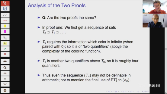 2021年2月26日下午4点,逻辑与数学基础系列讲座第14讲由新加坡国立大学数学系杨跃教授线上主讲,报告题目是:“Ramsey定理,反推数学及数学基础”。新加坡国立大学讲座教授、新加坡国家科学院庄志达院士主持。此讲座的内容大致可以分为三个部分。第一个部分是预备知识。杨跃教授从可计算性角度出发分别引入可计算集和一阶算术可定义集。在反推数学中,这两类集合分别对应递归论中RCA0和ACA0两个算术子系统。讲座的第二部分是证明反推数学中的几个定理。在证明Ramsey定理的过程中,杨跃教授运用了两种方法,一种通过不断提纯尾巴,另一种运用了二叉树的思想。讲座的第三部分是对数学哲学的讨论,主要涉及三个观察。第一个观察是绝对混沌是不可能的。第二个观察是数学问题的解比数学问题本身层次更高。第三个观察是秩序是真实存在的,我们要不断提升自己才能观察到这些秩序。
