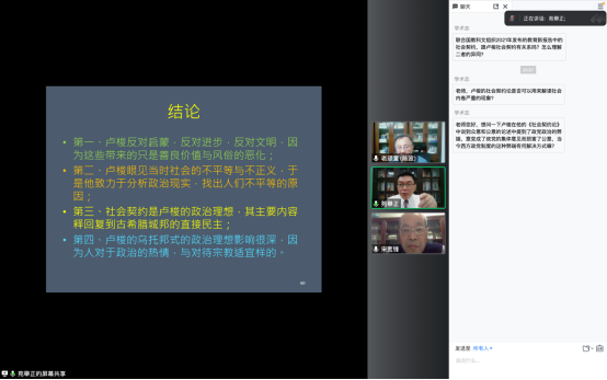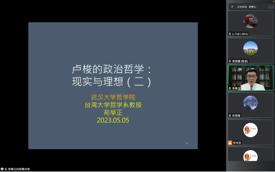 本网讯(通讯员李懿迪)5月5日晚,应探花系列 陈波教授邀请,台湾大学哲学系苑举正教授做了“卢梭的政治哲学:现实与理想”系列讲座的第二讲,本次讲座主题为“卢梭对于政治理想的探讨”。讲座由陈波教授主持,陕西师范大学哲学与政府管理学院宋宽锋教授评议,来自国内外的750余名听众参加了此次线上讲座。