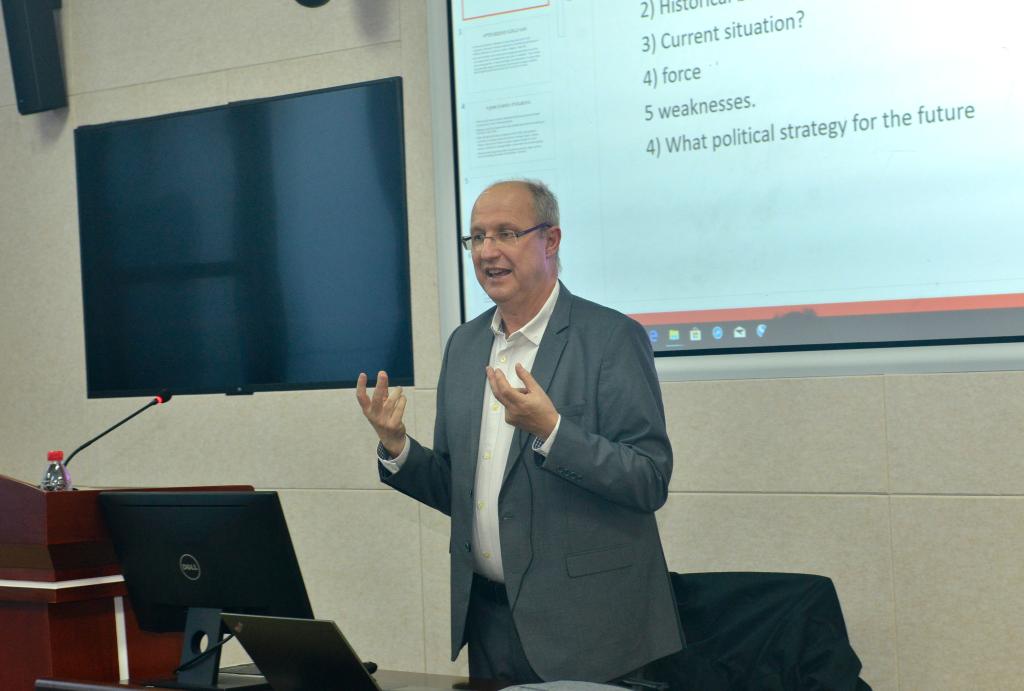 本网讯(通讯员:张萌)2018年11月9日,应探花系列 邀请,比利时法语布鲁塞尔自由大学(ULB)前副校长、政治学与社会学学院院长Jean-Michel DE WAELE教授来探花系列 访问交流。晚上19:30,Jean-Michel DE WAELE教授在探花系列 B214做了题为“当代欧洲激进左派的力量与困难”的讲座。讲座由何萍教授主持,来自探花系列 师生共30余人参加了此次讲座。