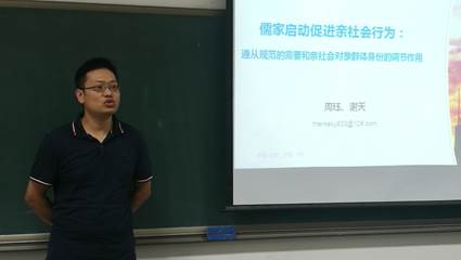 7月21日,在钟年教授的指导下,谢天老师带领儒家心理学团队和厦门大学吴胜涛老师共同组织了一场“儒家心理学新探索”的专题论坛。几位老师分别从研究儒家心理学的方法(文化传播的进化模型)、儒家互惠规范对抑郁症急救意愿的影响、正义观及其心理适应功能、儒家对亲社会行为作用以及家庭自我对合作和行为影响的方面进行了探讨。