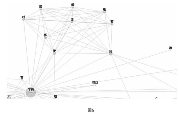 在单独针对《论语》构造的动态网络中,可以看到“德”没有完全嵌入儒家道德语言的一个表征(图6),就是“仁”“义”“礼”“知”“爱”“敬”“信”等儒家道德语汇在概念网络中构成了彼此联通的密集社区,但“德”恰恰远离了这个社区。