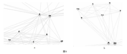 现在,如果说“德”在儒家文本中不具有第一序的重要性(尤其相对“仁”“义”等词汇来说),是因为这个概念在政治语境中的某些意涵未能真正融入儒家推崇的道德语言,那么就能说,恰是这些尚未道德化的政治意涵才使得“德”概念在道家文本中具有不可替代的价值。以《老子》为例,可以看到,其样本聚类簇中的若干网络复现了前述先秦两汉背景网络中出现的模式,即“德”首先关联于政治语汇,如“国”“天下”“治民”(图8a),此外还有比喻等级秩序的“上下”、作为治理手段的“无为”(图8b)等。同样模式在另一部道家经典《庄子》中也很显著。不过,回到之前提及的先秦两汉背景网络中的情况,即“德”与“天地”的连接似乎意味着这个概念的政治色彩不显著。实则不然,因为在《庄子》中同样能看到这种连接模式,却显示出显著的政治关切。在“德”与“天地”构成联系的概念网络中,出现了“虚”“静”“虚静”“无为”这类概念节点(图9a、9b),正是黄老道家描述执政者排除个人偏好或成见、没有主观盲动的典型修辞。因此“德”与“天地”的关联或许应被解释为“天地”对待万物的态度就是执政者应当效仿的“虚静”“无为”,正如《庄子》所见的: