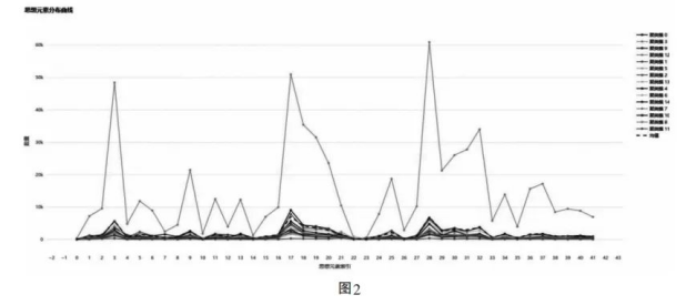 这项工作将从构造“德”概念出现于早期中国思想的背景网络开始。基于聚类和降维实验,“齐物智算”模型将先秦两汉的主要子学和经学文本聚合为15类,这是轮廓系数(Silhouette Coefficient)、卡林斯基-哈拉巴斯指数(Calinski-Harabasz Index,CH)和戴维斯-博尔丁指数(Davies-Bouldin Index, DB)综合评分为0.83的最佳结果(图1a),表明模型有能力识别不同文本在思想上的内在关联。不过,聚类和降维结果对人类研究者还需要解释(图1b)。“齐物智算”模型则绘制了在训练和微调时已经学习到的思想元素在各聚类簇中的分布曲线,能帮助研究者对所涉及全部文本在思想上的基本关切有一个粗粒度的判断(图2)。