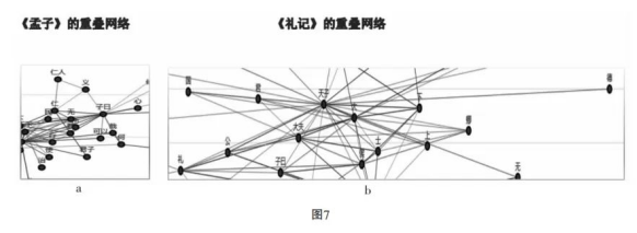 当然,以上所见仅是《论语》中多个动态网络之一,还不够有代表性。但当AI进一步为《孟子》《礼记》单独绘制其概念网络时,会发现“德”概念远离儒家道德词汇社区的情况出现在所有动态网络存在交集的重叠网络中,这就显示出模式化的普遍性。比如,在“仁”作为核心节点的概念社区中没有“德”(7a),“德”亦不在“礼”所关联的概念社区中(7b)。此外更极端的情况是,在《孟子》所有的概念网络中,“德”都未作为独立节点出现,在《礼记》中,“德”也只在一个聚类簇的概念网络中出现。