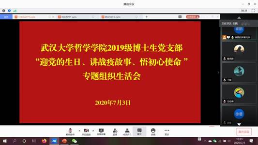 本网讯(通讯员:詹思群)2020年7月3日下午,探花系列 2019级博士生党支部开展了“迎党的生日、讲战疫故事、悟初心使命” 专题组织生活会和“共庆政治生日,永葆入党初心”的主题党日活动。支部党建指导老师吴昕炜出席本次会议,支部全体党员、积极分子参会。