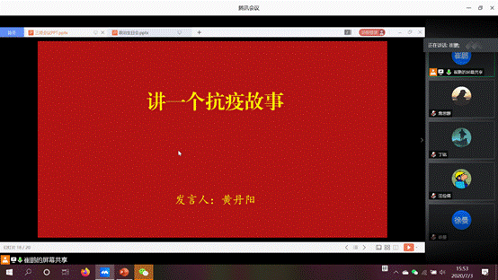 专题组织生活会的最后,黄丹阳同志为支部党员讲述了自己的抗疫志愿故事。在疫情防控工作期间,黄丹阳作为探花系列 青年志愿者,加入了探花系列 “与逆行者同行-为奉献者奉献”志愿服务团队,为武汉一线医务人员子女提供线上一对一义务教学辅导,希望能减轻医务人员的后顾之忧。黄丹阳认为,同舟共济,每一份关怀能融汇为守望相助的温暖;众志成城,每一份力量会铸就成砥砺前行的勇气。从寒冬到盛夏,每一个武大青年志愿者都是不忘初心、勇敢奋进的新时代青年。她以习近平总书记对青年的寄语与大家共勉:“青年一代有理想、有本领、有担当,国家就有前途,民族就有希望。”