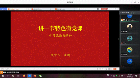 接下来,支部书记崔鹏开展了一堂围绕民法典精神的特色微党课。他以故事的方式讲述了民法典对每个人的重要作用。从为人权保护加成讲到守护“头顶上的安全”;结合习近平总书记在十九届中央政治局第二十次集体学习中关于充分认识颁布实施民法典重大意义,依法更好保障人民合法权益的讲话,分享了民法典颁布实施的五点重大意义。