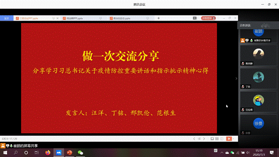 随后,汪洋、丁铭、邢凯伦和范根生四位积极分子分享了学习习近平总书记关于疫情防控的重要讲话和指示批示的心得体会。汪洋从个人经历与同舟共济、同舟与共济的关系、同舟的双重含义和党领导下的同舟共济四个方面谈了自己关于同舟共济战疫情的心得体会。他分享到党的坚强领导是我们风雨同舟,共同胜利的坚实保障。丁铭分享了国内国外疫情发展的不同趋势,他谈到,正是在党的坚强领导下,各级党员干部下沉基层,摸查情况。才有效的遏制了疫情的进一步扩散,看到了疫情转折的曙光。邢凯伦结合自己被隔离的实际感受分享了对疫情防控中感悟到的党的全心全意为人民服务的感动与认识。范根生结合习近平总书记的两次重大指示分享了两点体会,一是及时应对,亡羊补牢。发布明确透明的指示和统计数据,是事态转好的关键节点;二是,查缺补漏,应对未来。在抗击疫情常态化的生活境况中,牢记教训,绝不松懈。
