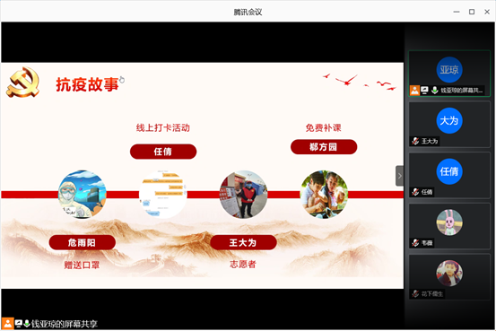 首先,任倩、王大为、郗方园、危雨阳四位同志分享了他们在抗疫期间从事的工作。任倩同学分享了她参与大学生心理卫生协会“疫情大作战活动”的经历和体会。王大为同学分享了为医务人员子女辅导和参与社区志愿者的经历。郗方园同学分享了辅导隔壁高中生的经历。危雨阳同学分享了自己作为武汉人在疫情期间的心路历程。