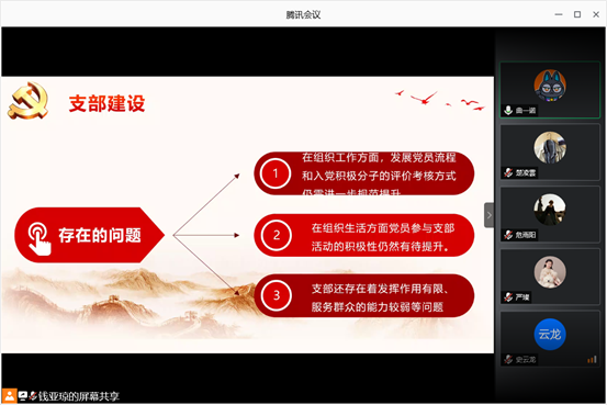 充分交流过后,大家又对支部建设问题进行了讨论。钱亚琼同学指出,支部现在还存在一些问题,在组织工作方面,发展党员流程和请假入党积极分子考核方式仍需进一步规范提升;组织生活方面,支部党员参加支部活动的积极性仍应加强;支部还存在发挥力量有限、服务党员和群众不够有力等问题。支委会成员分别就自己的工作做出了批评了改正意见,呼吁支部党员加强对支委的监督,党员同志们也分别提出了建议。