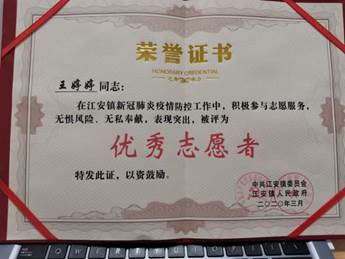 2019级美学专业的王婷婷同学也参与到家乡的抗疫志愿工作中,并被评为了“优秀志愿者”。她说,作为新时代的青年,应当奋斗在党和国家需要的第一线,身体力行发挥党员的先锋模范作用。