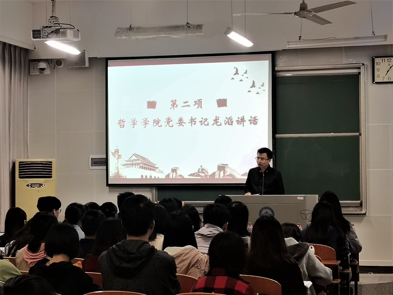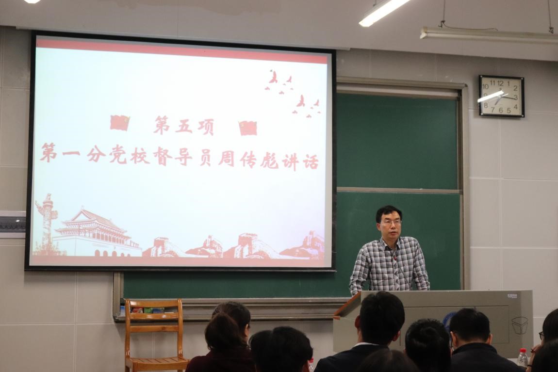 第一分党校督导员周传彪老师向大家介绍了自己督导工作的内容及章法,希望同学们能提高自身政治素养,坚定理想信念,为社会注入更多正能量。