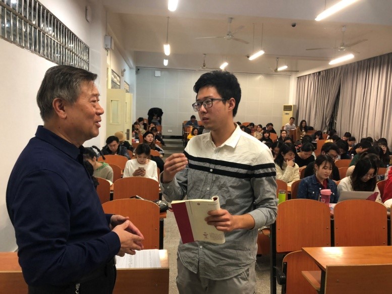 马克思主义学院夏建国教授率先给同学带来了第四讲——“中国共产党的指导思想”的精彩内容。夏建国老师首先向各位学员强调了“社会生活本质上是实践的”这一命题,希望各位学员发挥中国共产党党员的先锋模范带头作用,积极投身到有益的社会实践中。紧接着,夏建国老师通过介绍马克思、列宁和毛泽东等伟人的生平,深刻地向各位同学展示了中国共产党指导思想的丰富内涵和发展历程,使各位学员进一步深化了对党的指导思想的认识。最后,夏建国老师对全体学员提出要求:坚定不移学习、贯彻和宣传马克思列宁主义、毛泽东思想、邓小平理论、“三个代表”重要思想、科学发展观和习近平新时代中国特色社会主义思想,努力为新时代党和国家各项事业的建设贡献自己的力量。课后,夏建国老师还与同学们展开了进一步的沟通交流。
