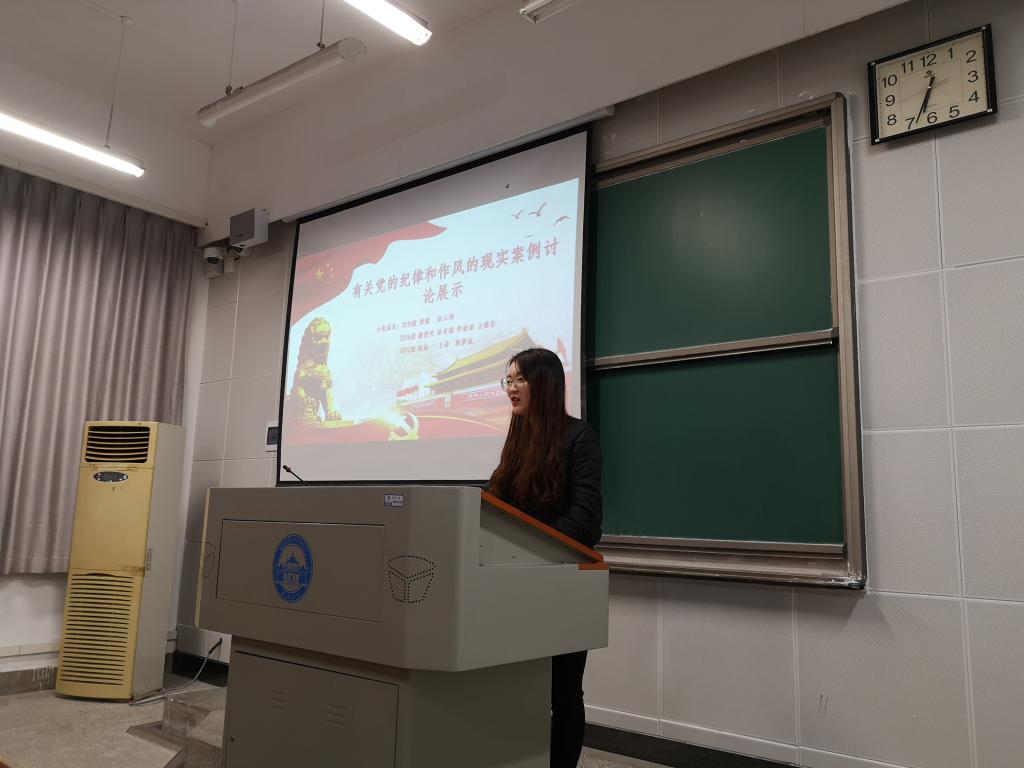 首先,文学院第一小组的全体同学轮流上台,阐述了“道私者乱,道法者治”,党的纪律是维护党的团结统一、完成党的任务的保证;党的作风关系到党的形象、人心向背,关系党和国家的兴衰成败的观点。小组成员使用大量发人深省的事实案例,通过与党纪条例比对和分析,向同学们展示了经济犯罪、滥用职权、政治错误、诬告陷害等违反党纪、污化党风的行为,同时也坚定了同学们对共产党一心为民,不忘初心的信仰。