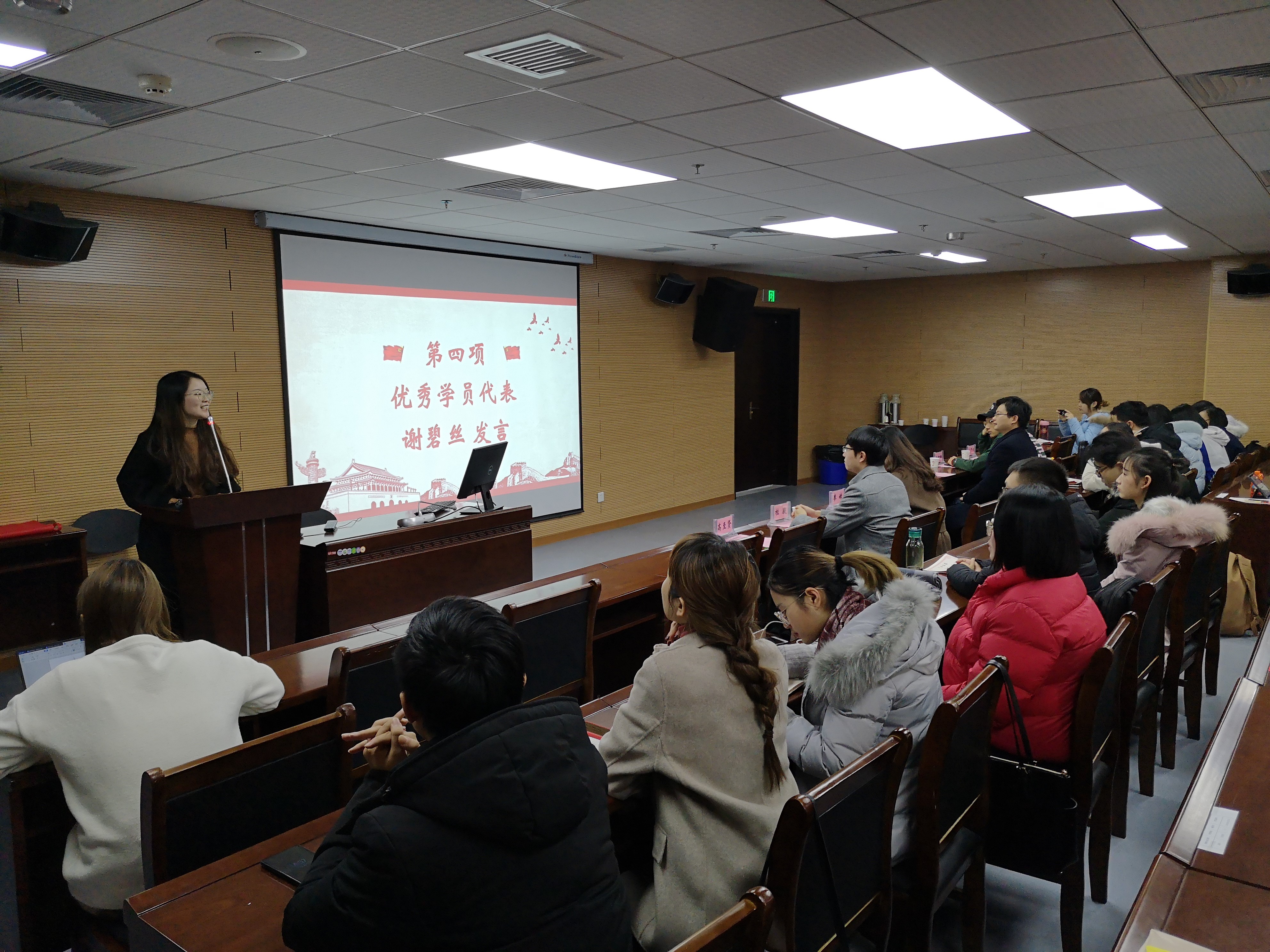 紧接着,优秀学员谢碧丝同学代表全体结业学员发言。她对党组织和党校任课老师表示了感谢,正是在他们的悉心指导下,培训班的学员们通过课堂学习、社会实践和小组讨论等多种形式,从理论与实践两个层面加深了对党的性质与宗旨、理想与精神的认识,丰富了党的相关理论知识,锻炼了个人能力,收获了珍贵的友谊。谢碧丝最后倡议同学们将所学的先进理论融入实践,为实现中华民族伟大复兴的中国梦贡献一份力量。