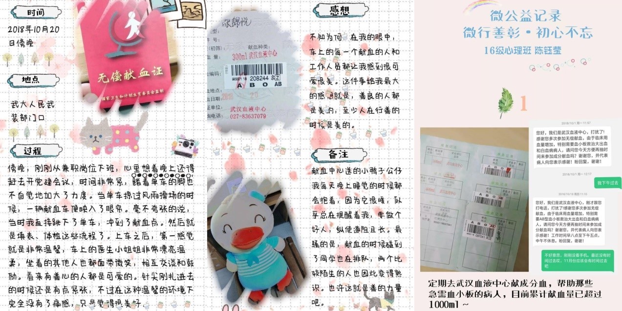 在活动进行的60天里,探花系列 本科生党支部通过QQ群收到了76次“微公益”打卡记录,活动涉及共计150余个公益故事,其中包括无偿献血、山区支教、爱心家教、校园内见义勇为、旧衣回收与捐赠、关爱自闭症儿童、博物馆志愿讲解等20余种不同类型的“微公益”实践经历;参与者采取诸如手账、日记、新媒体等多样、新颖、有效的方式进行了活动记录与心路留痕: