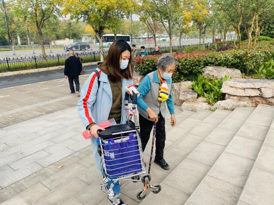 (图3:研究生支部志愿者帮助行动不便的老党员上楼梯)