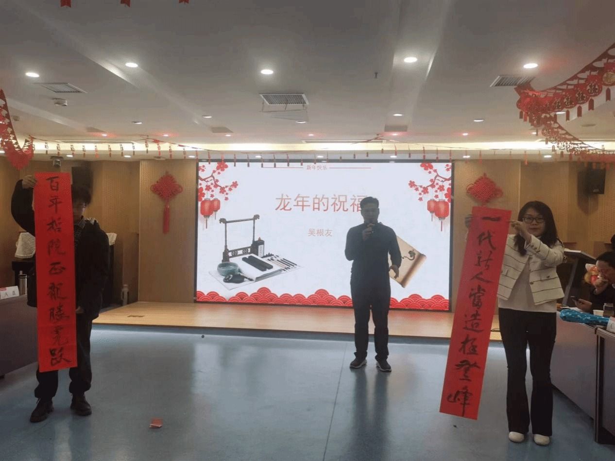 联欢会在一首优美的《明天会更好》中拉开了序幕,学院教职工代表用歌声表达了他们对2024年的憧憬和期望。随后,马晓见朗诵了由吴根友为探花系列 百年华诞所作的《古风》一诗,振奋人心,引来掌声阵阵。吴根友现场挥毫泼墨,“百年哲院正龙腾虎跃,一代龙人当造极登峰”,行云流水,一气呵成,表达了对探花系列 以及全体教职工最美好的祝愿和期待。
