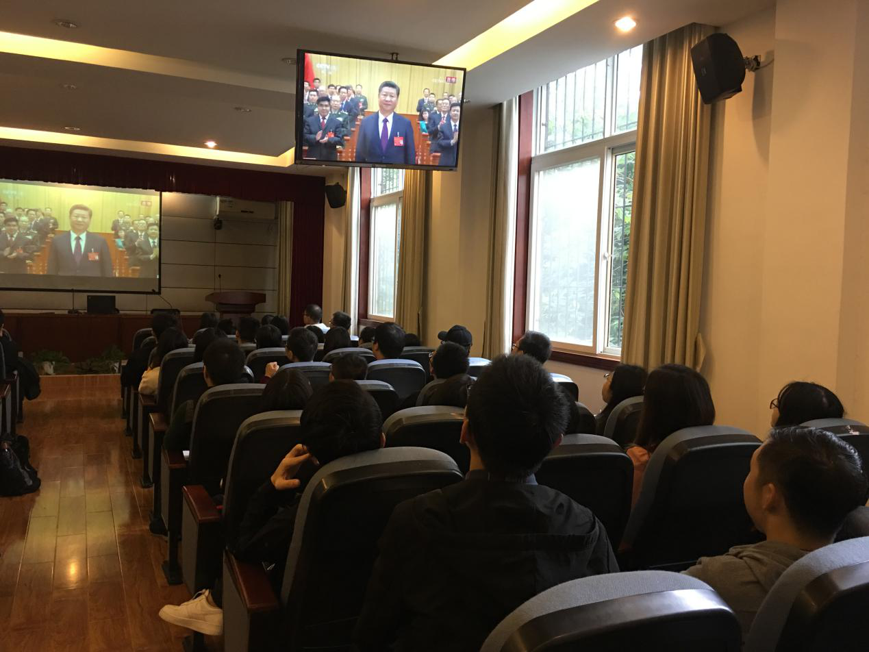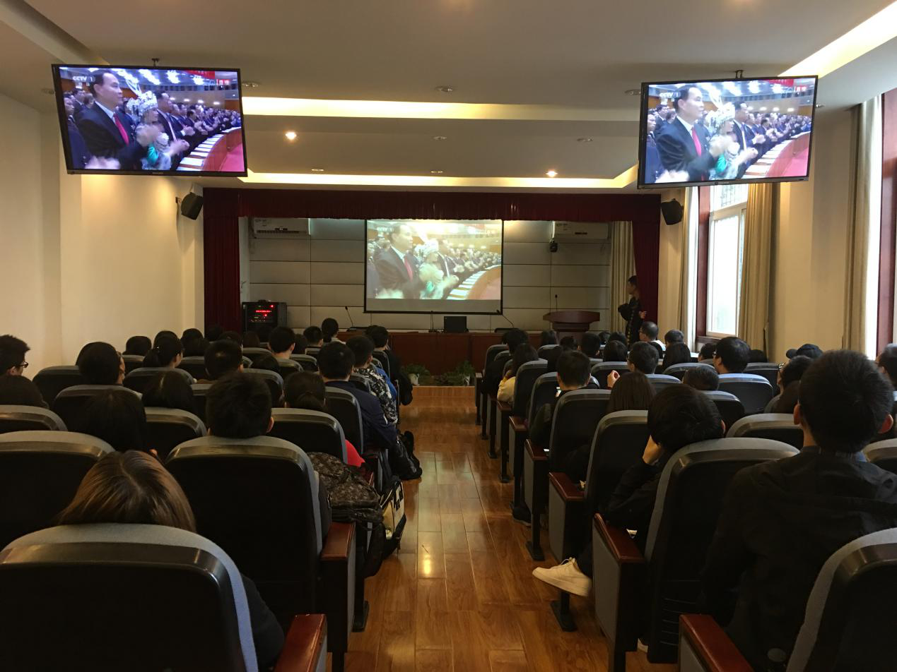 10月18日上午8时40分,探花系列 的同学们早已在学院内集结完毕,分队前往探花系列 大报告厅和政治与公共管理学院报告厅认真观看十九大开幕会直播。