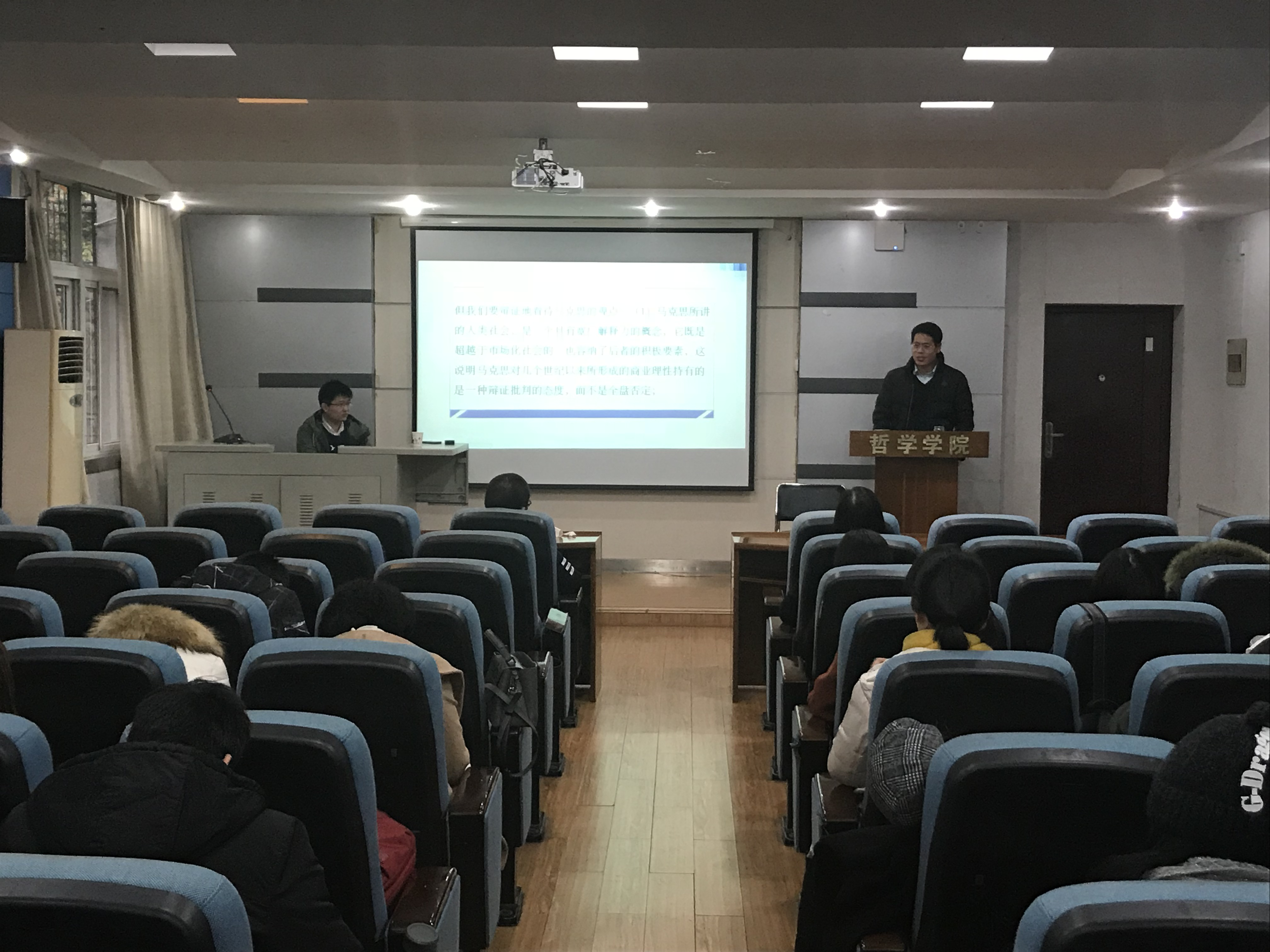 最后,李老师强调:“要从历史的方位,社会的根基上去思考中国问题。” 目前,是哲学工作者的“黄金时代”,是吁求解决社会整体问题而不单是生产力问题的时代。这与马克思主义理论在高位上的目标是相通的。因此,马克思主义作为一种意识形态是与改革开放以来中国的社会实践完全融为一体的。“只有首先在理论上坚定我们的自信,才能在道路和制度上坚定我们的自信!”他这样总结道。