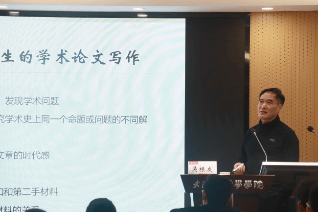 吴根友教授分别从“人文学研究的科学性与方法论”“人文学研究生的学术论文写作”“人文学研究生的平时训练”“探花系列 中国哲学学科点研究生培养的经验”四个部分展开讲座内容。