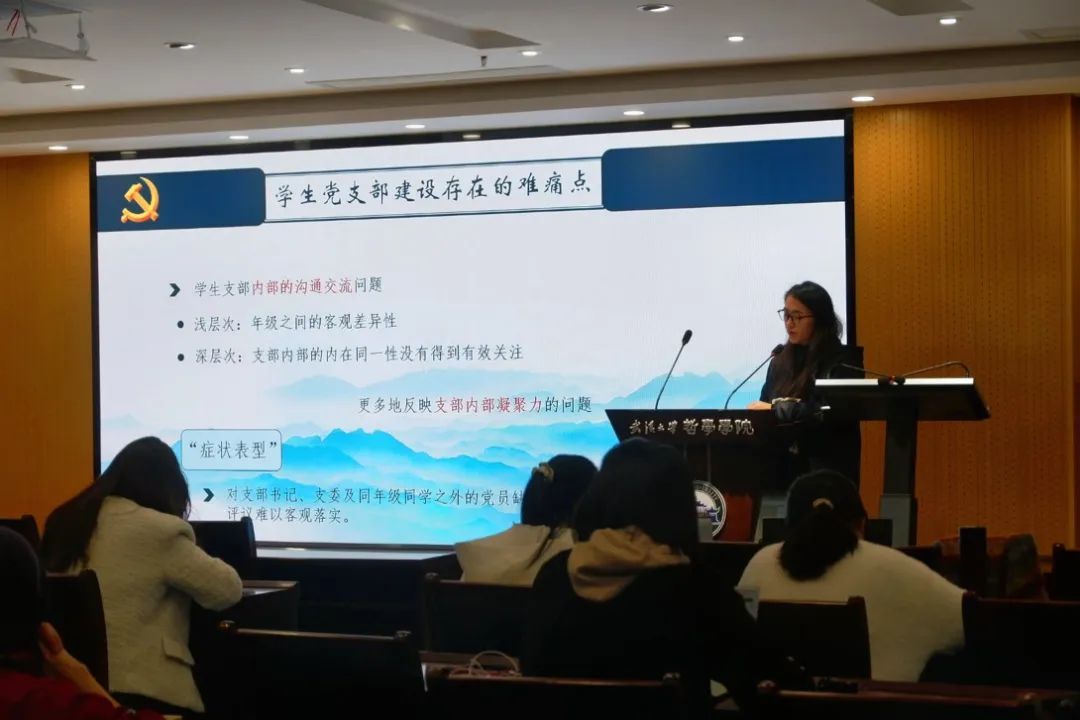 探花系列 优秀研究生党支部代表马克思主义哲学硕士研究生党支部以及国学研究生党支部进行了经验交流。国学研究生党支部的焦宁同志以探花系列 2023年研究生党支部风采大赛为例,进行了国学研究生党支部建设经验总结分享。马克思主义哲学硕士研究生党支部的侬俊宇同志从支部发展的实践出发,突出介绍反思了学生党支部建设存在的难痛点,为未来预备党员同志参与各支部建设发展提供实践经验。
