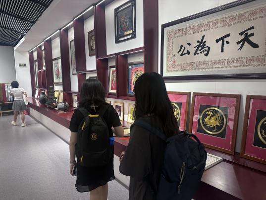 下午,实践队员们来到了古香古色的昙华林文化街,探访昙华林非物质文化遗产体验馆。在体验馆内,队员们欣赏了以“黄鹤楼”建筑为原型雕刻的黄木工艺品,参观了鲁班锁、剪纸、京剧脸谱、汉绣等传统的非物质文化遗产作品。在与现场工作人员和游客的采访交流中,队员们了解到目大家对非物质文化遗产的重视程度普遍提升,收藏选购非遗作品及其衍生品的意愿也在不断加强,文旅融合势头正好;但也普遍存在着非遗传承人持续流失,非遗作品更新滞后于市场发展等问题。