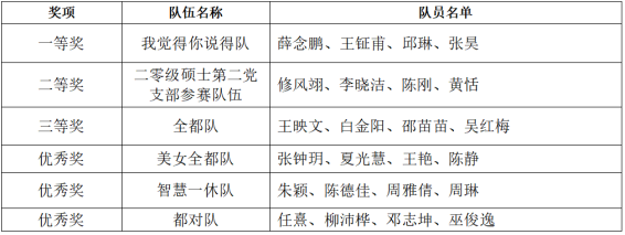 最后,是比赛的颁奖环节,经过激烈的角逐,“我觉得你说得队”获得一等奖;“20级硕士研究生党支部参赛队”获得二等奖;“都对队”获得三等奖;“美女全都队”、“智慧一休队”、“都对队”三支队伍获得优秀奖。