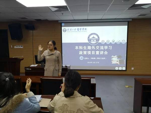 学生出国事务办公室的刘晓婧副主任首先针对低年级同学尚不清楚如何有效获取出国境交流信息的情况,向大家推介了探花系列 国际交流部官方微信公众号“武大海外学习”以及官方网站。同学们可以通过这两种渠道了解国家公派、校际交流、寒暑假短期、学院自主项目等多种对外交流项目的信息,选择合适的项目进行申请报名。同时,考虑到出国境交流期间花销较大,她也对同学们非常关心的专项奖学金政策作了详细阐释,让同学们对学校的相关资助政策有了更多了解。