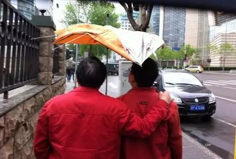 2011年在中国青年报附近拍的,当时我们从外面吃完饭回来,下雨了,他俩只有这么一把伞,我跟在他们后面,really喜感地拍下了这张图发在微博上,并且取了个标题“一把破伞,两个红人”。左边为吴湘韩,右边刘万永。