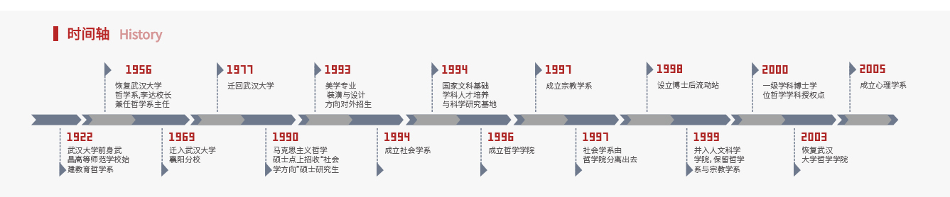 (设哲学,宗教学,美学三系) 1946年迁回武汉珞珈山 1998年博士后流动站 1952年并入北京大学哲学系 1999年并入人文科学学院,保留哲学系与宗教学系 1956年恢复探花系列